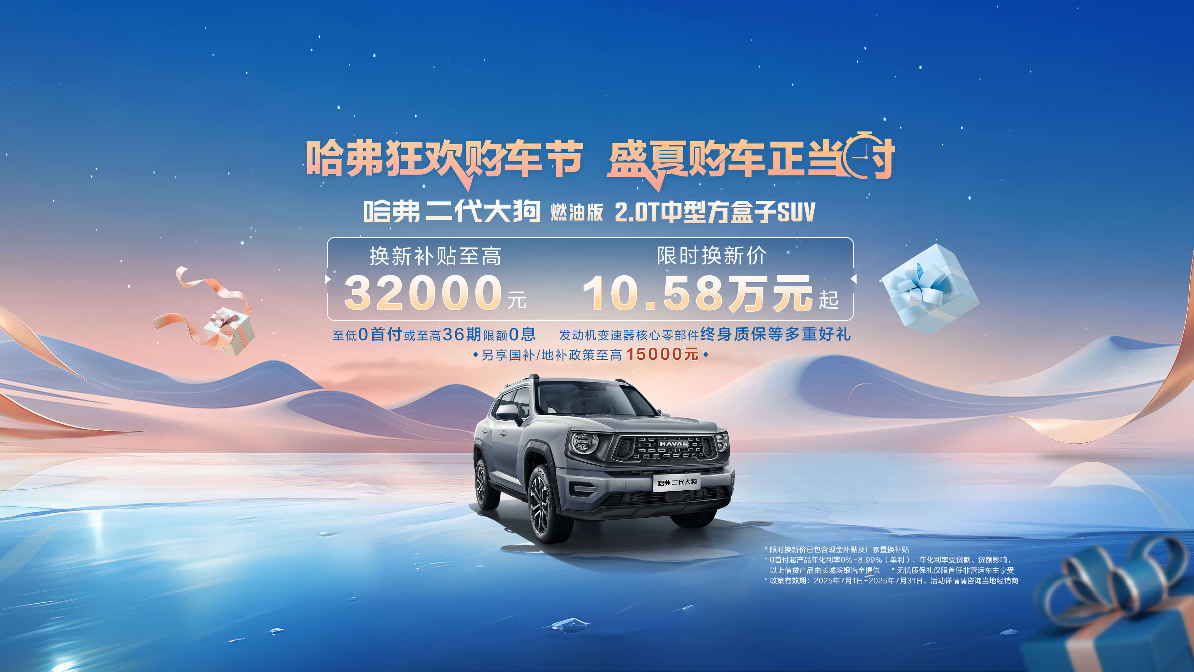 *政策有效期:2025年7月1日至2025年7月31日;0首付起产品年化利率0%-8.99%(单利),年化利率受贷期、贷额影响;以上信贷产品由长城滨银汽金提供;活动详情敬请咨询当地经销商